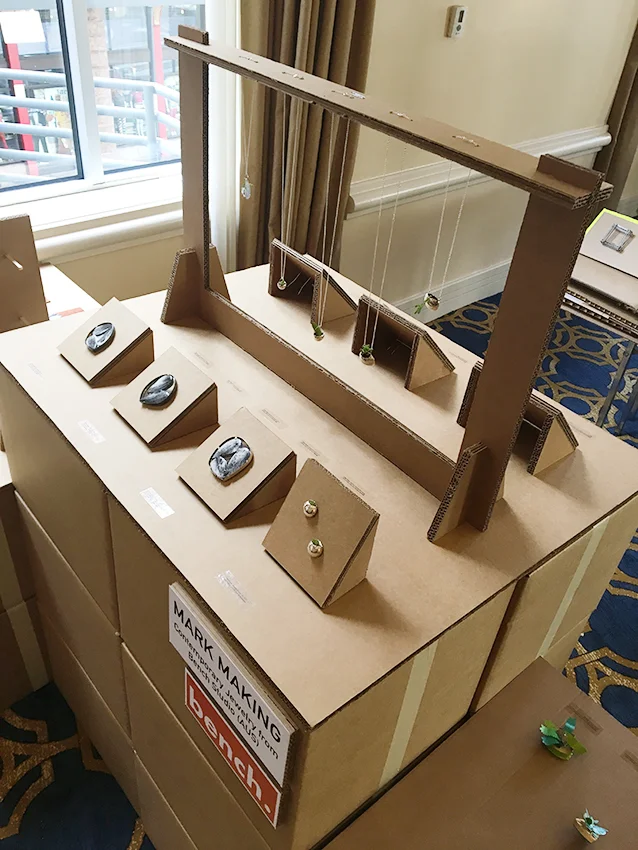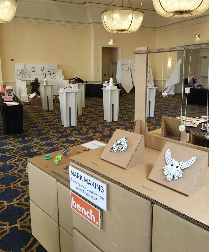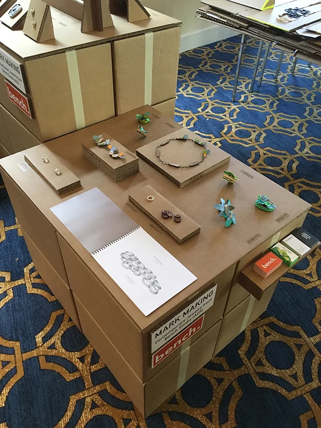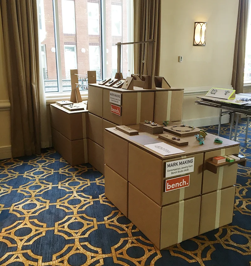 The conference (May 24-27, 2017) was overwhelming wonderful, exceeding my expectations and giving me the opportunity to connect with many people who make art jewellery or work within the field. I arrived a few hours before registration on the Wednesday to install the Bench exhibition Mark Making for Adorned Spaces. At the suggestion of the coordinators, many exhibitors built their displays using cardboard (cheap, easy to travel with and recyclable) and ours was no exception. It was a really fun suggestion and unsurprisingly, no two displays were the same. During set-up I stepped out for half an hour to meet with Bella Neyman, director of the Gallery at Reinstein|Ross in New York, for a portfolio review. Bella is so sweet and very knowledgeable and passionate about art jewellery. She gave me feedback on the work I showed her, suggested that Graduate school should only be a choice for personal growth, not a 'must-do', and impressed on me the importance of having jewellery photographed ON THE BODY. Sometimes I overlook the obvious and it was great to chat with her about these things. After thanking Bella and returning to finish the Adorned Spaces install it was time for the conference to begin!